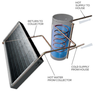 panel to the solar storage tank. The heat exchanger in the tank transfers the
